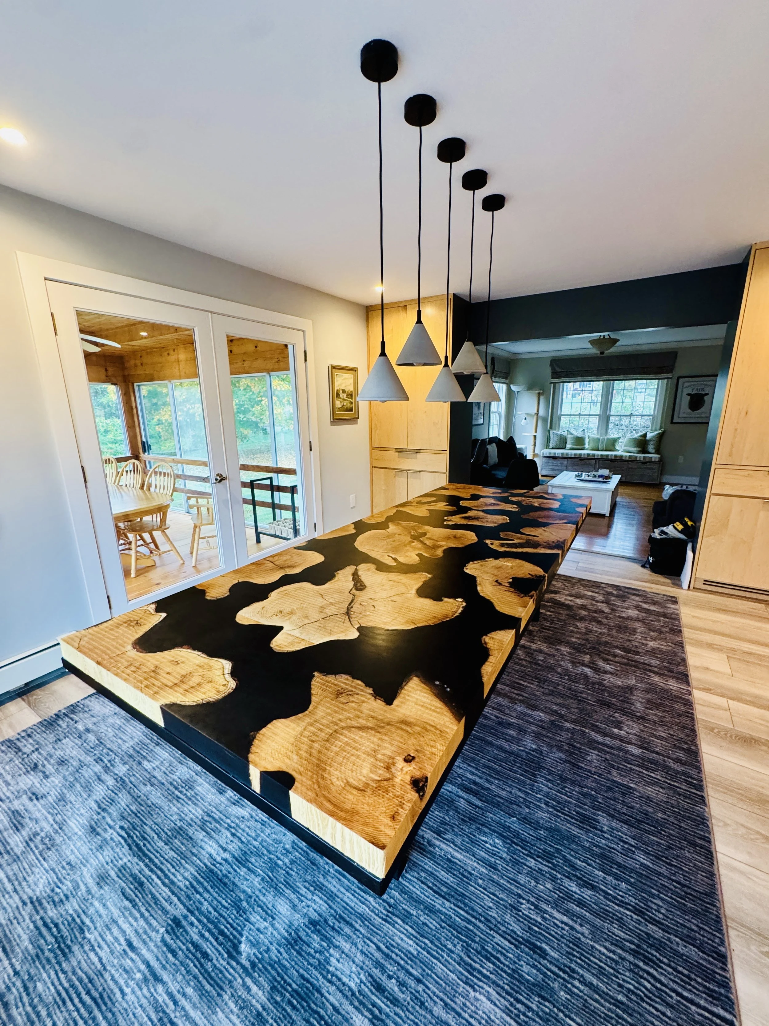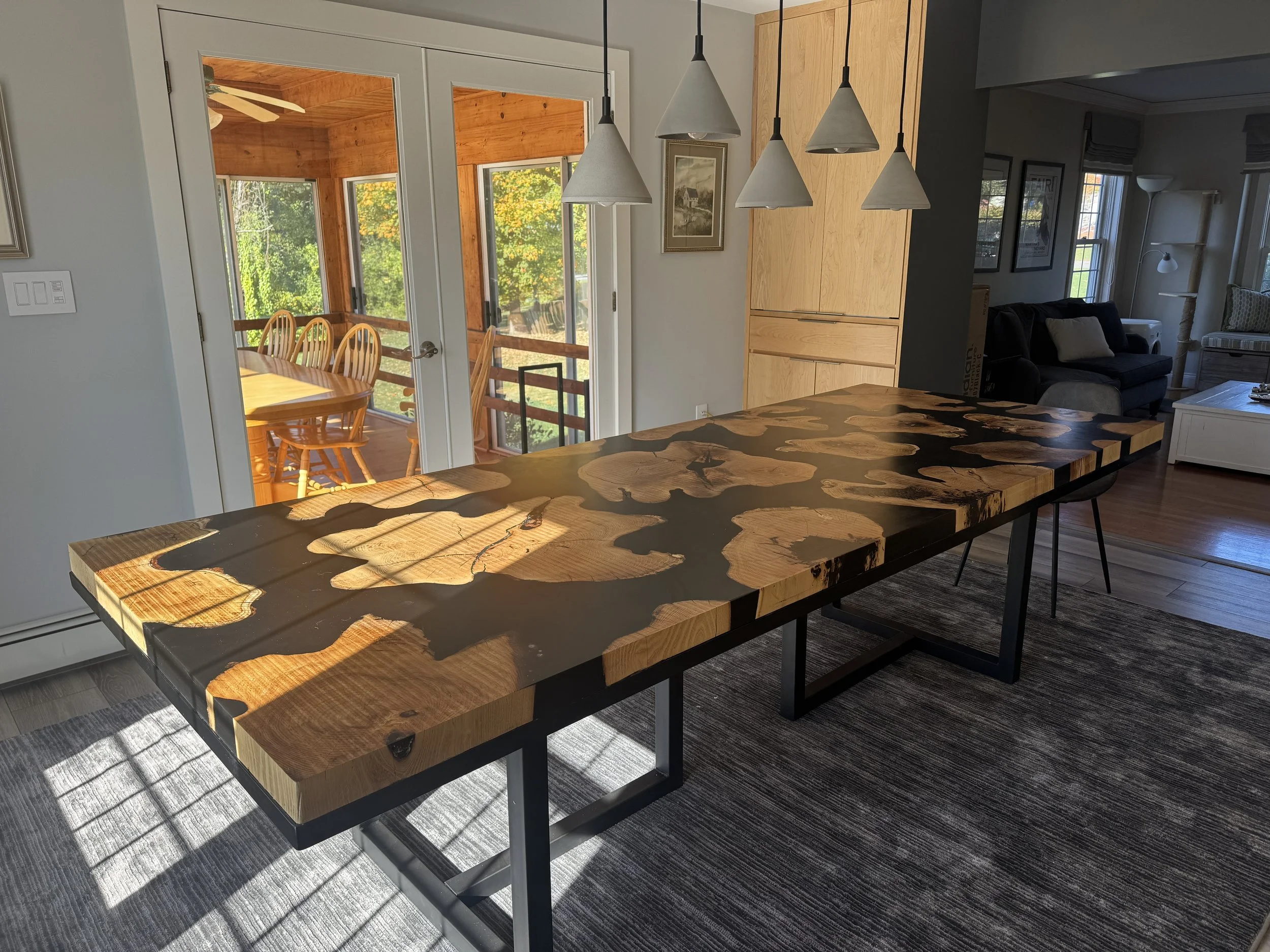 Working with deep black resin, we filled the negative spaces between wood sections, creating a composition that reads like an aerial view of an archipelago. The resin pools and flows around the locust islands, its glossy surface contrasting with the wood's warm, textured grain. Light catches differently on each material - absorbed into the wood's depth, reflected sharply off the resin - creating subtle shifts in appearance throughout the day.